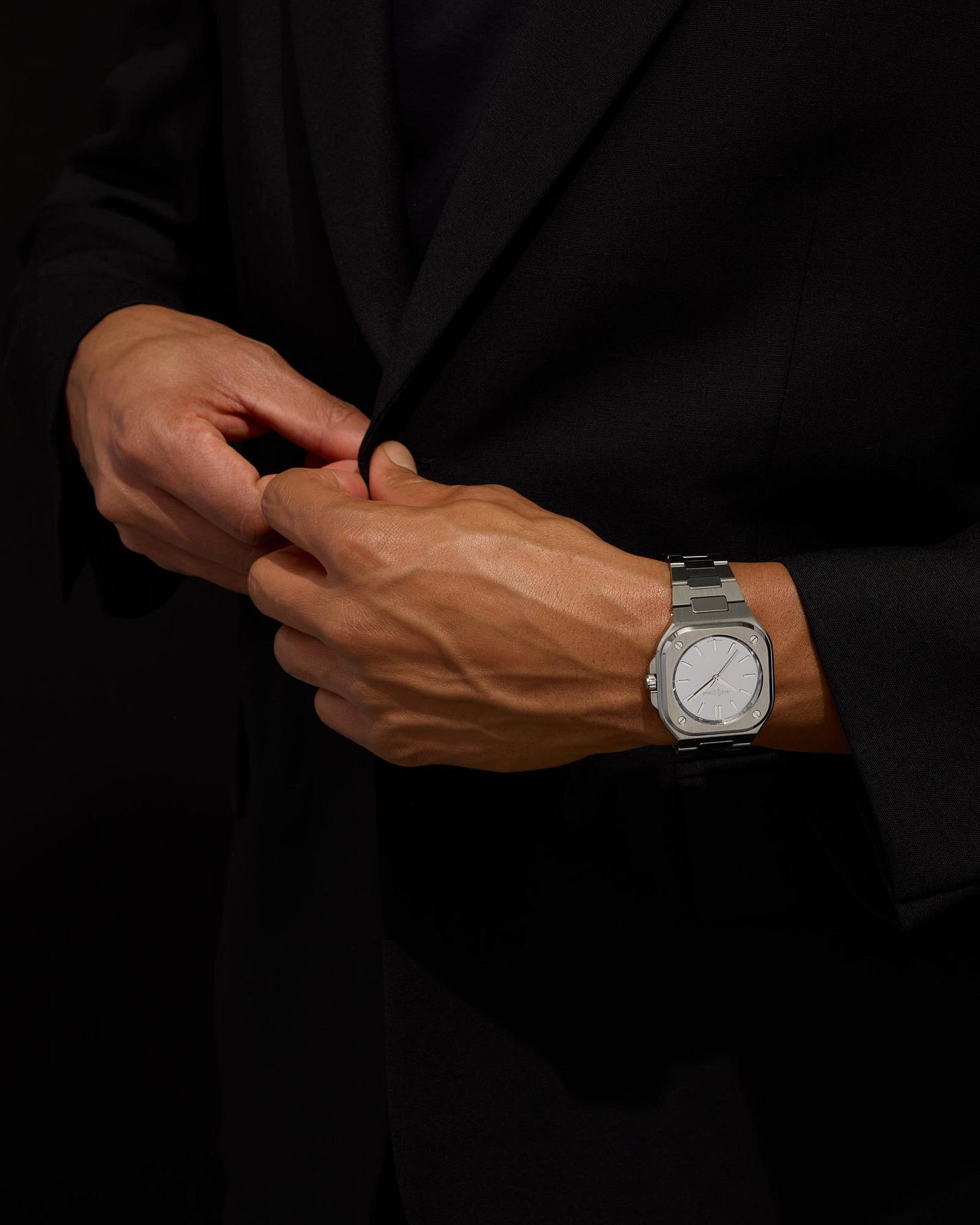 Inside you get the BR-CAL.321-1 automatic, with a quoted 54 hour power reserve. That is mid range modern, enough that you can take it off for a day and still find it running the next morning. The case is the familiar BR 05 square with rounded corners and exposed screws at the lugs, which has always read like a softer, less aggressive take on the original BR 01 instrument square. On the bracelet it should sit close to the wrist and wear larger than the numbers suggest, as most integrated designs do.