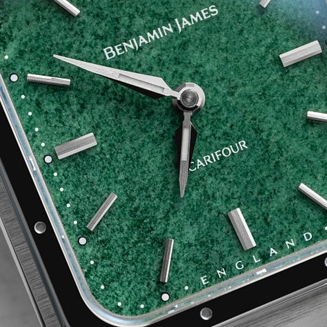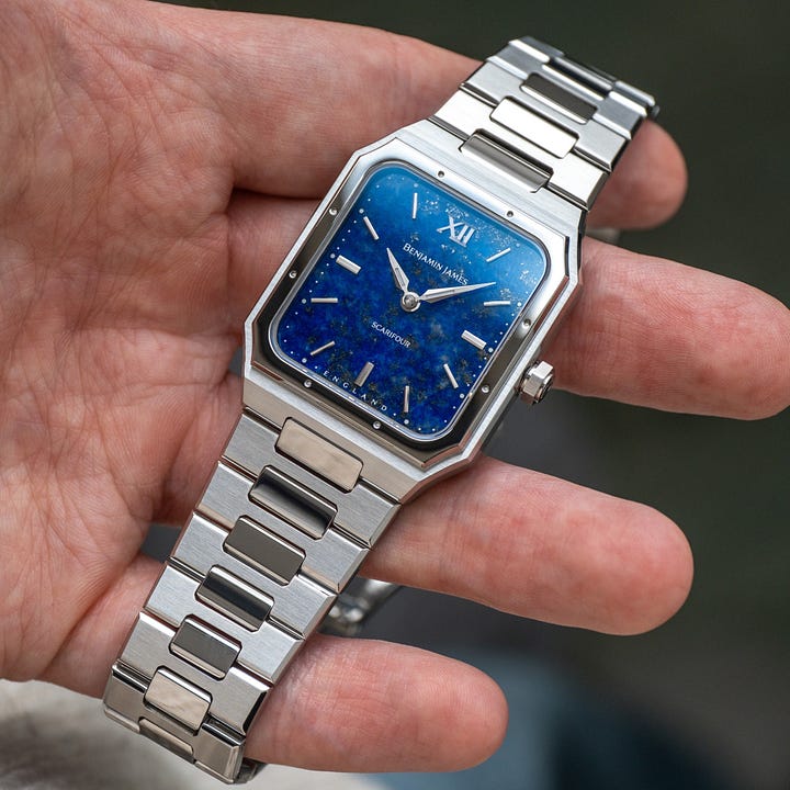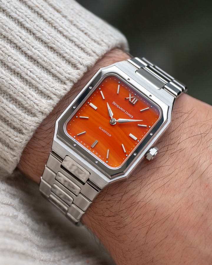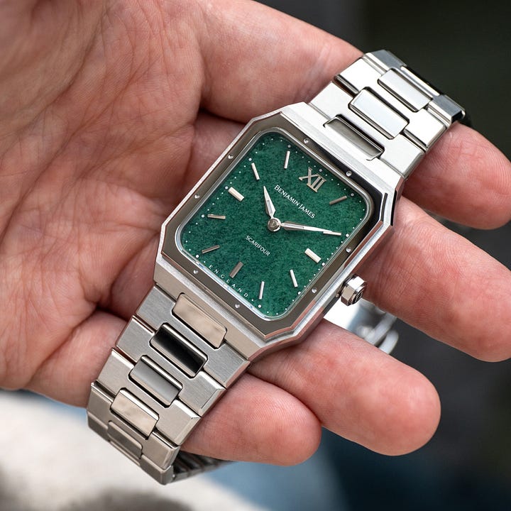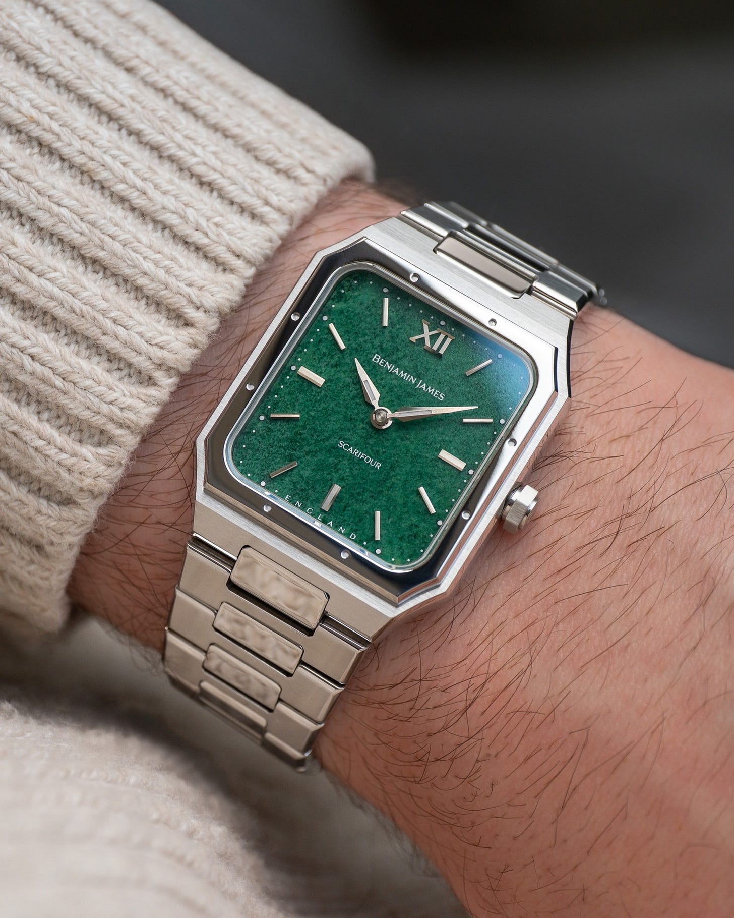 If you want a dress watch that is not your standard circle paired to a leather strap, the Benjamin James Scarifour is a compelling alternative. Square watches are not nearly as common, and ones as thin as these on a bracelet are more normally in the realm of luxury watches. In this case, the three stone-dialed options are $1,356. You can check out the full range of offerings directly at benjaminjameswatches.com