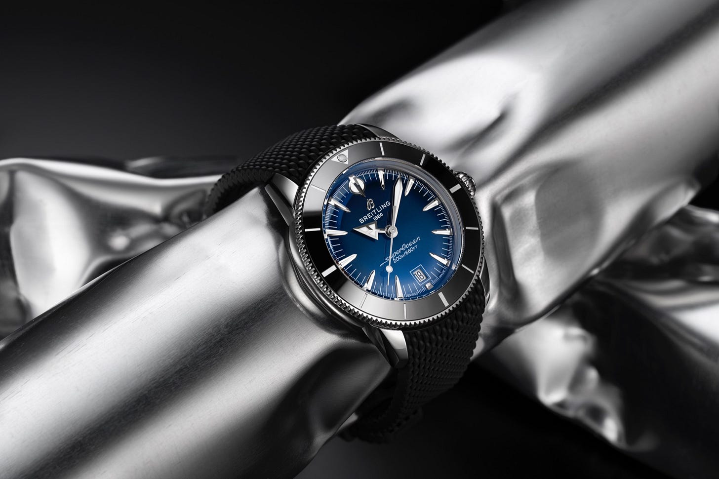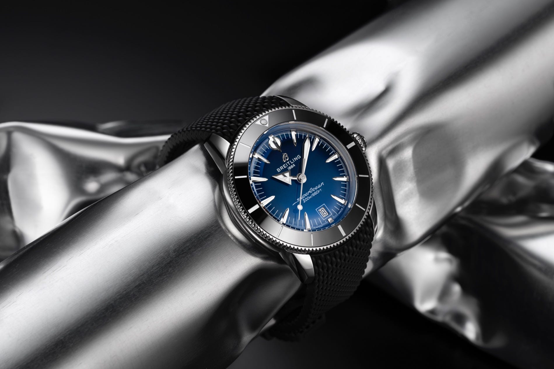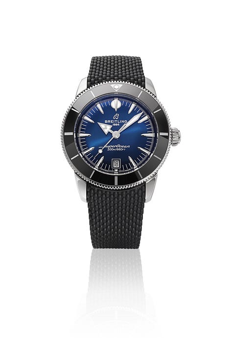 Well, it’s a Superocean B31, of course, in a 42mm case. What sets this one apart, specifically, are the colors used. On the dial, you’ve got the blue that we see used on Bucherer collaborations, and it’s paired with a black ceramic dive bezel insert. While there have been blue dials in the line, this is the first time it’s been paired with a black bezel.