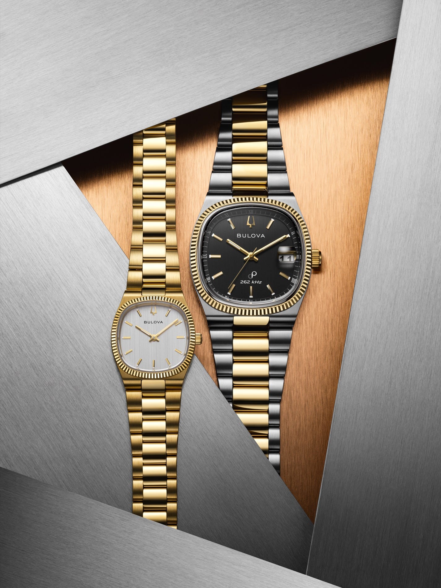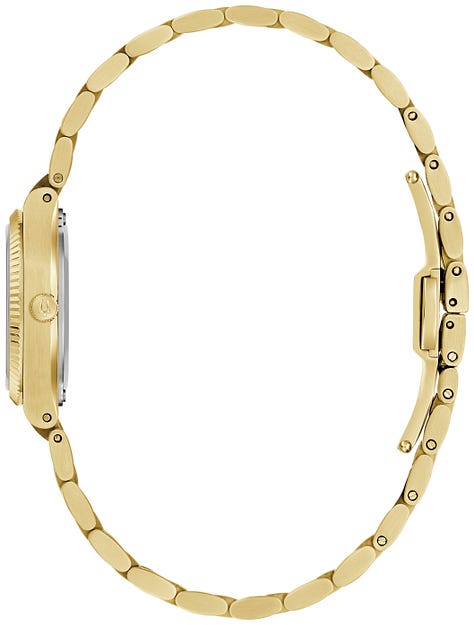 97L189: Gold-tone case/bracelet with a vertically brushed silver dial and gold-tone accents.