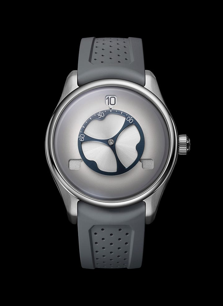 Reference 3240-1200, steel model, White fumé dial with 3 discs for the hours and a central wheel for the minutes, grey rubber strap