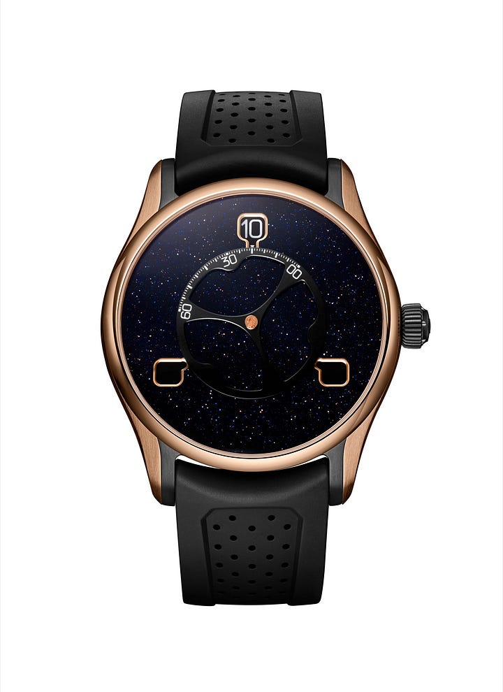Reference 3240-0900, model in 5N red gold and titanium with black DLC coating, aventurine dial with 3 discs for the hours and a central wheel for the minutes, black rubber strap, limited edition of 100 pieces