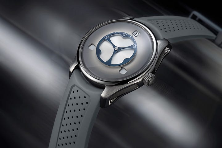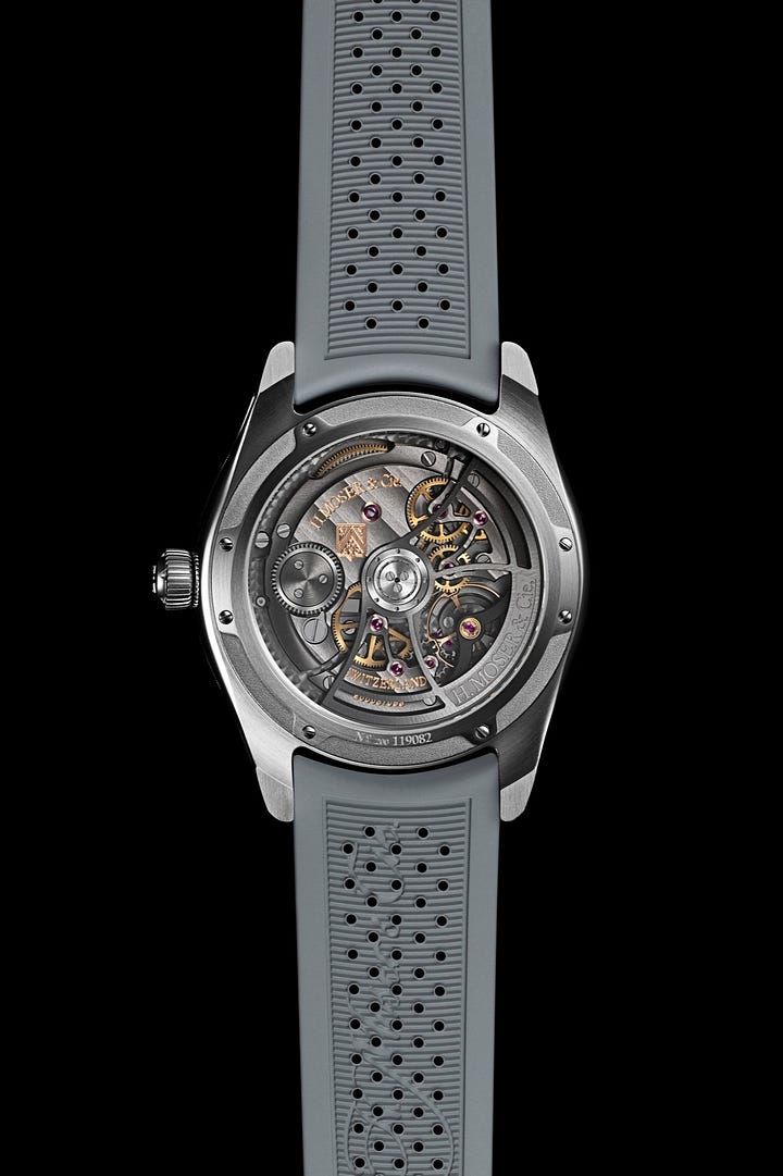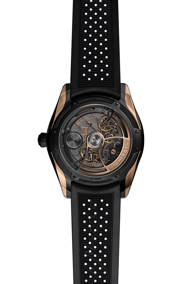For this design, Moser kept the original “planetary” style of indicating the hour. Rather than keeping the discs visible on the dial, however, they’ve gone with windows that indicate the current hour. As the marked central disc rotates, the minutes are indicated. When they get to the next window, the next hour is indicated. While the exposed discs of the original do have that “wow” factor, this version keeps things a bit more restrained.