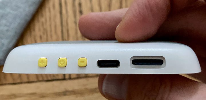 This is pretty straight-forward. It’s a small speaker that’s charged up via USB-C. How small? Well, it’s about the size of a credit card, and as thick as a slice of bread. In other words, easy to slip under a pillow, and not really notice it there. In terms of playing sounds, you’ve got two options. The familiar one will be bluetooth, which can connect to your phone, tablet, or even (we presume) your smart TV (presume, as we didn’t test this out).
