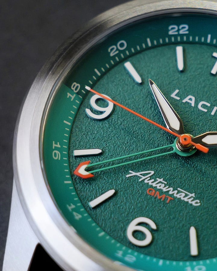 Fittingly for a watch equipped with a GMT (which frequently indicates air travel), I’m picking up some aviation watch design cues on the Lacité Urbanite GMT. First off, there’s the applied numerals, which have a font we often see on pilot’s watches. Secondly, you’ve got the sword handset, which again, often shows up on a flying watch.
