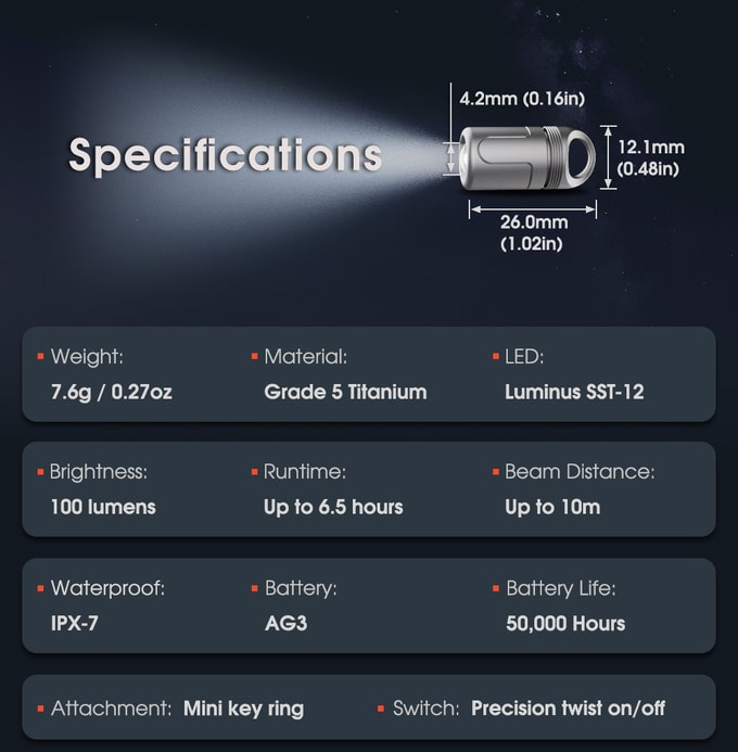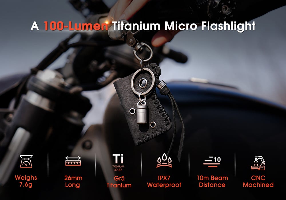This is about one of the smallest EDC flashlights that you’re going to find. It’s small enough to disappear on a key chain, but tough enough (via it’s titanium shell) to stand up to the abuse of living on a keychain, or being otherwise shoved in a pocket, every day.