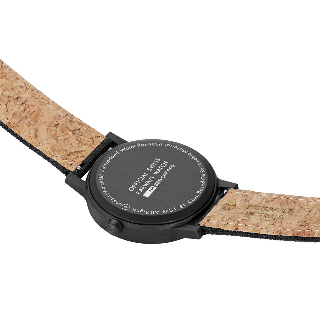 The 41 millimeter case is made of a composite of about forty percent castor oil, thirty percent glass fiber, a small amount of pigment, and under thirty percent fossil oil to keep it stable. The strap on the white model is recycled PET textile on top with a cork lining underneath. It is light, soft on the wrist, and easy to swap thanks to quick-release bars. Mondaine is aiming for low impact, but also for parts you can replace so the watch lasts longer than a single strap.