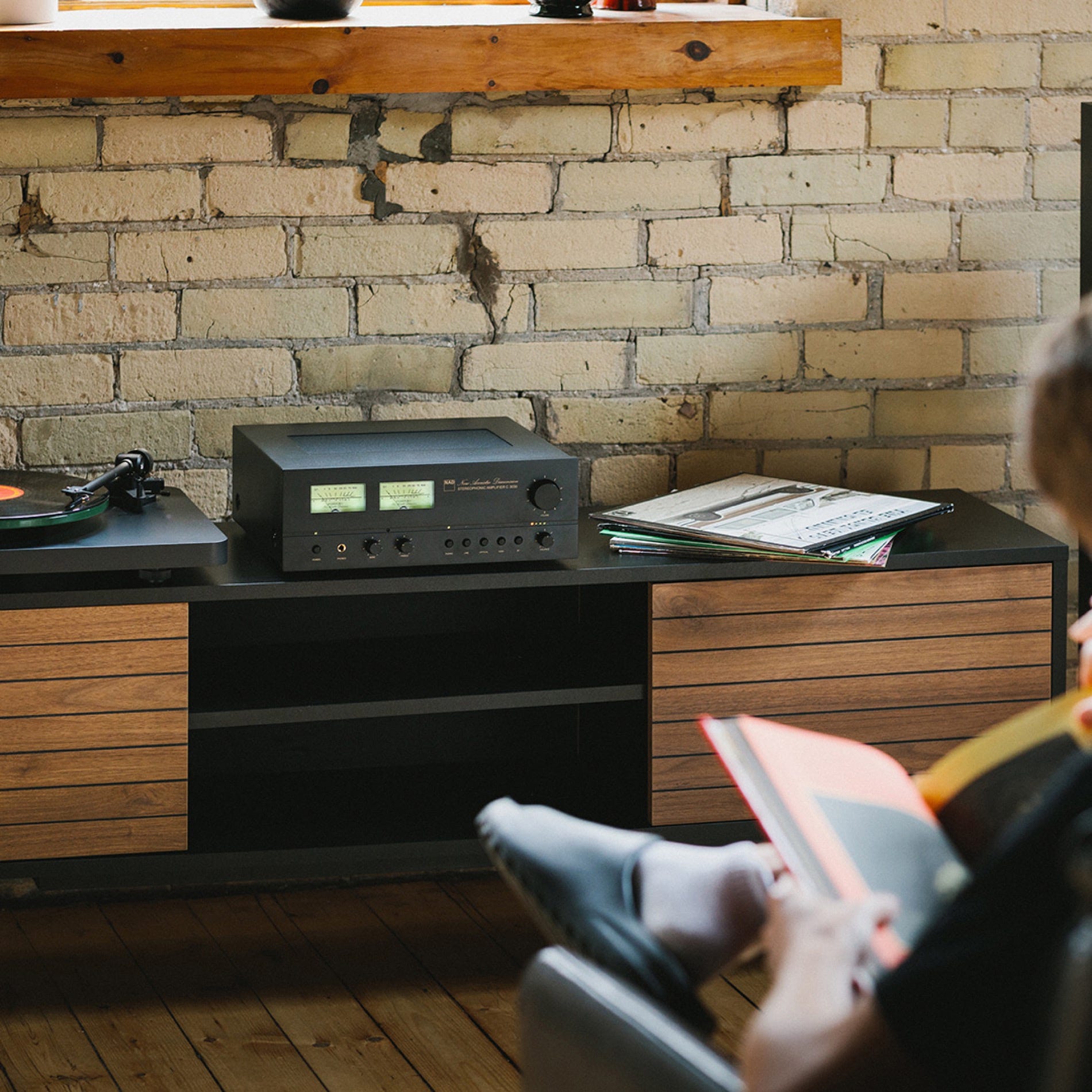 Retro design details including VU meters and cursive NAD logo
