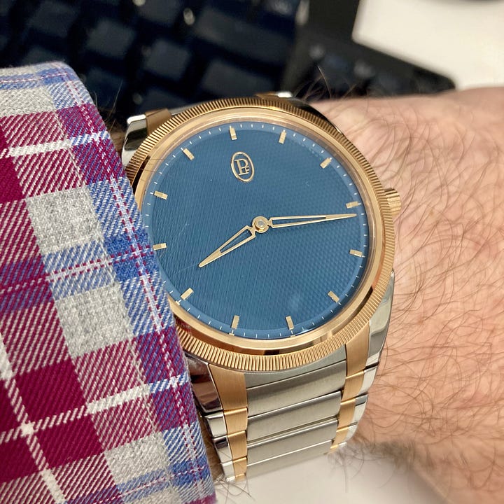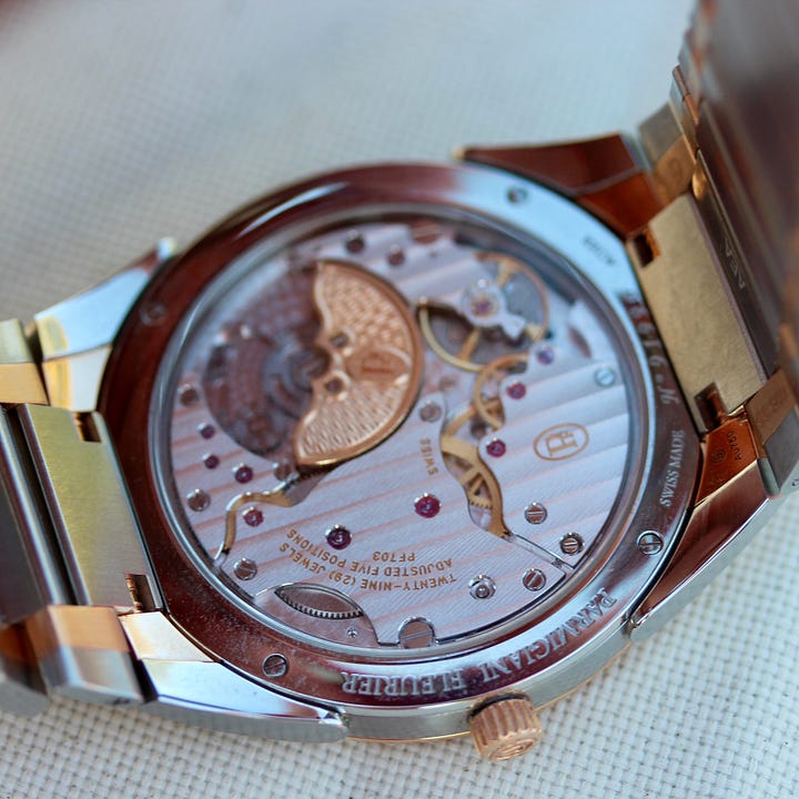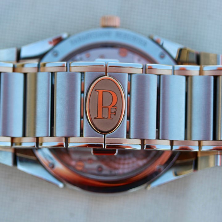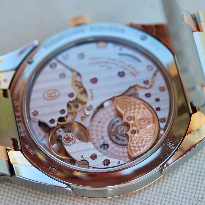 It’s the latest addition to the Tonda PF Micro-Rotor family, of course. While other versions have kept things completely mono-tone, this version is their first foray into a two-tone for the line. Here, things are primarily steel, with rose gold taking up accent positions on the bracelet, bezel, handset, indices, and crown. Also, around back, you’ll see that the micro-rotor is also made of rose gold. While I’m not a big gold watch guy, this one felt like it had just the right amount to elevate the elegance without becoming boorish.