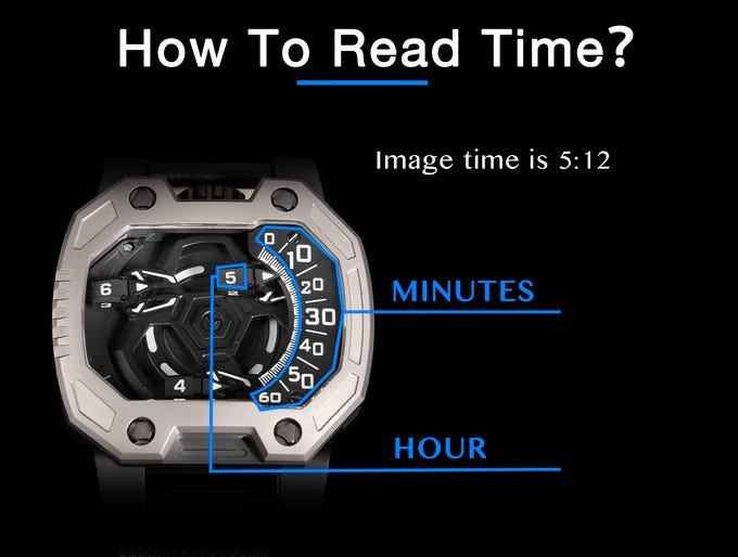 Well, that’s where the photos really come into play. Over on the right-hand side of the case, you’ve got the minutes scale printed. Then, there’s a hand (three of them, actually) that point at the minute. The hour is indicated on that hand (see the photo below). So, it’s a unique way to display the time. Where things get really fun is when the hour on the hand rotates (each hand displays 4 hours), giving a bit of kinetics to the time display.