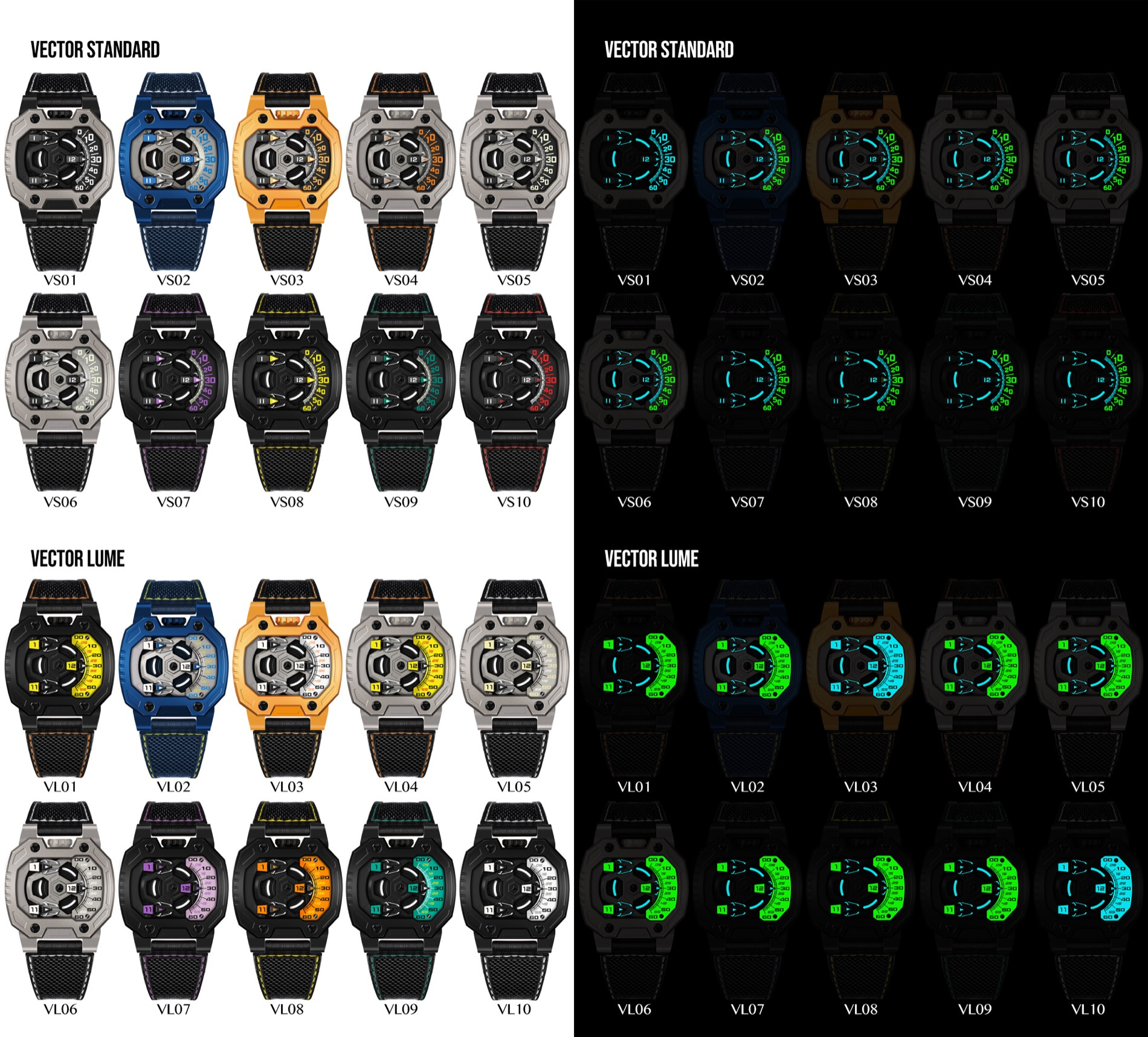 Along with the overall design approach, they’re also offering the Power Panda Vector in a wide variety of styles. First, you have to decide if you want the standard version (which does have luminous paint on the numbers), or if you want the lumed version, which turns the hour and minute surfaces into fully-luminous areas. Then, within those, you’ve got a wide range of color choices (you can see those down below).