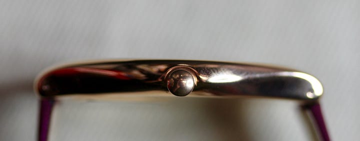 In other words, this is the sort of watch that works for someone who just wants the simplicity of a quartz watch for basic timekeeping, but wants it to be usable in a variety of situations. With the gold-tone case and fuscia accents, it definitely can pass as a dress watch. Given that it’s also paired to a color-matched strap, though, it means it can also work as a casual watch.