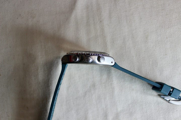 Once the watch is set, it’s as fuss-free as you’d expect any quartz watch to be. Other than the occasional adjustment of the date display for months shorter than 31 days, , or daylight savings changes, you won’t need to mess with the crown. Then, the pushers flanking the crown are as expected: the upper one starts (and stops) the yellow chronograph seconds, while the lower pusher resets it, with the seconds hand trundling around the dial to get back to zero.