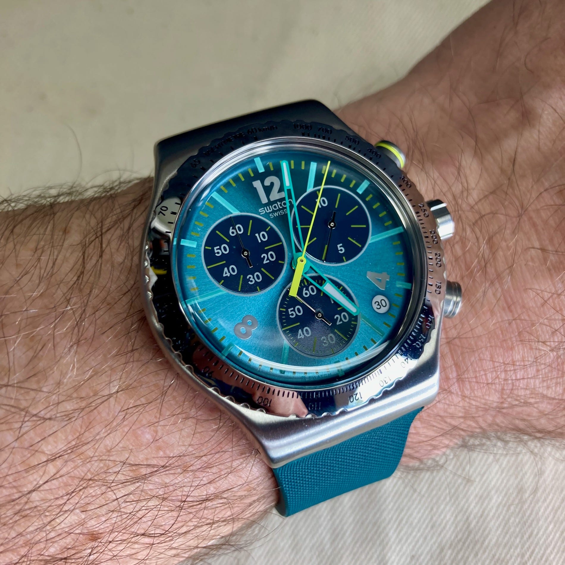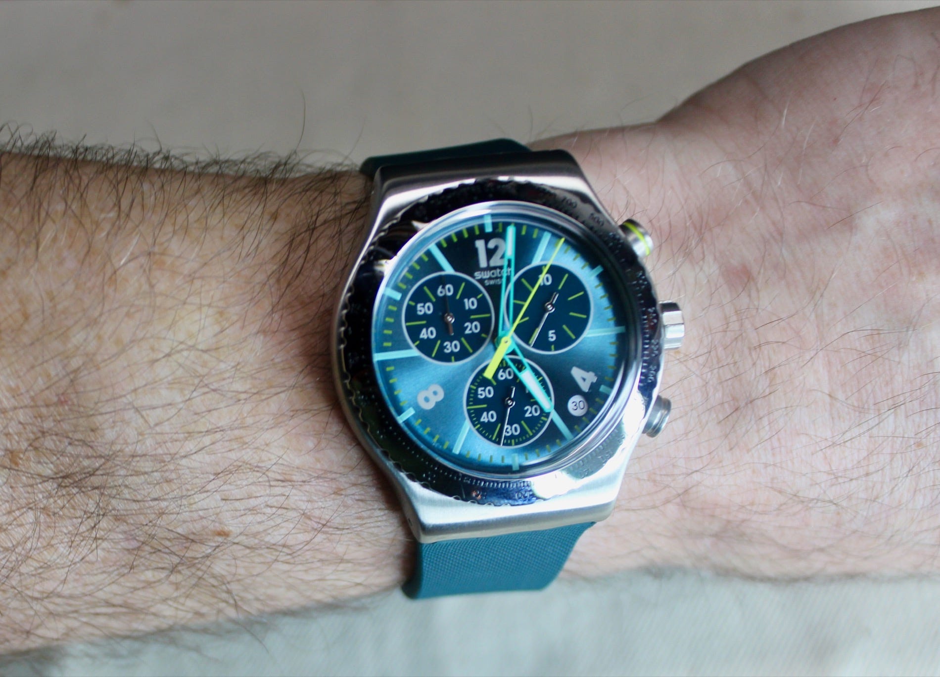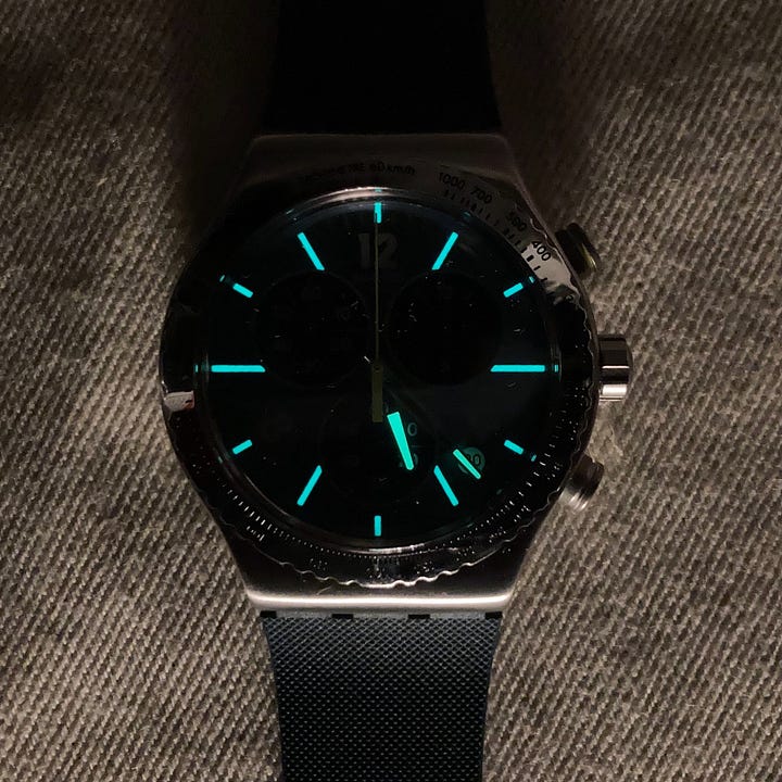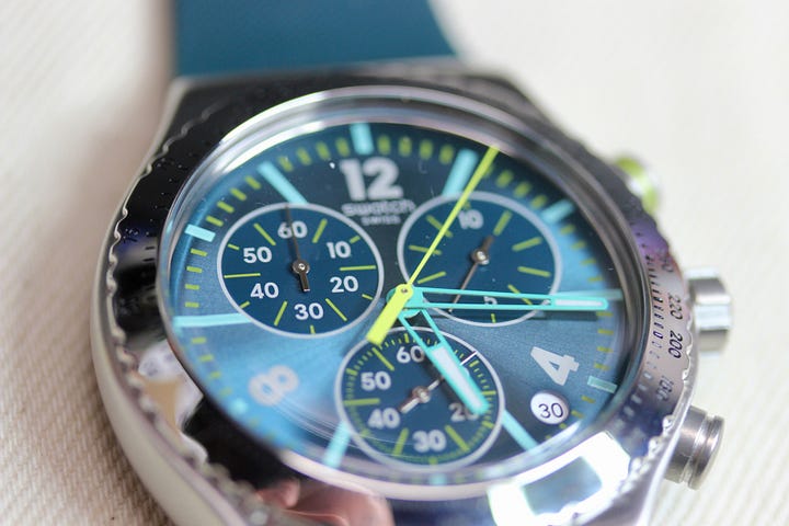 While I’m not much for chronographs myself, I did not mind it on the days when the Swatch Greenshift Glow was on my wrist during the loan period. It works well as a daily-wear watch (just no swimming, with the 30m WR rating), and the color here is one that you’re not commonly seeing on a watch.