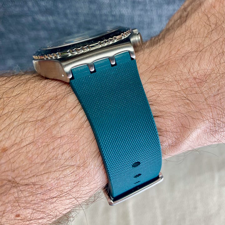 While it’s called the Greenshift Glow, it’s a green hue that leans more towards the blue. Not so much that it would be called turquoise, but it’s definitely more blue. This works well with the teal accents for the indices and the partially-skeletonized handset. That color also continues on into the integrated rubber strap, cementing the overall hue. For the chrono subdials, those are done in a textured black, with simple, polished hands.