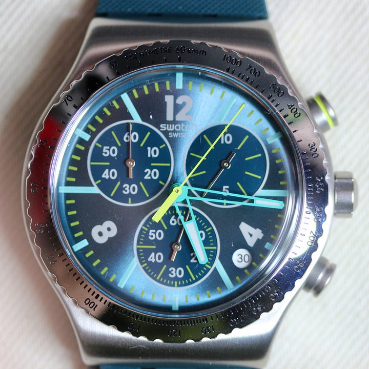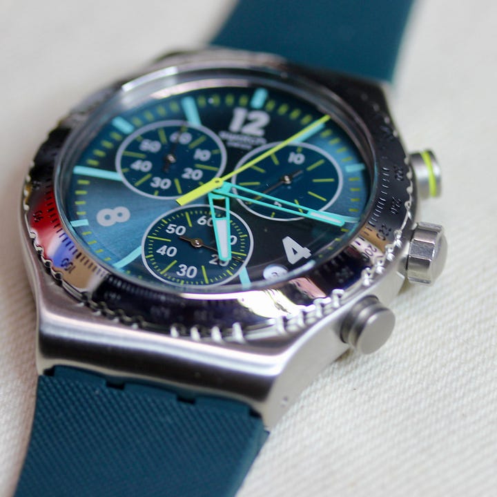If you’d like to get one of these on your wrist, you can do just that for $210. If that particular color way doesn’t do it for you, there’s also one with a golden dial on a darker blue strap, and then of course there’s the whole Irony chronograph lineup. For the latest version, you can check it out - and buy it - directly at swatch.com