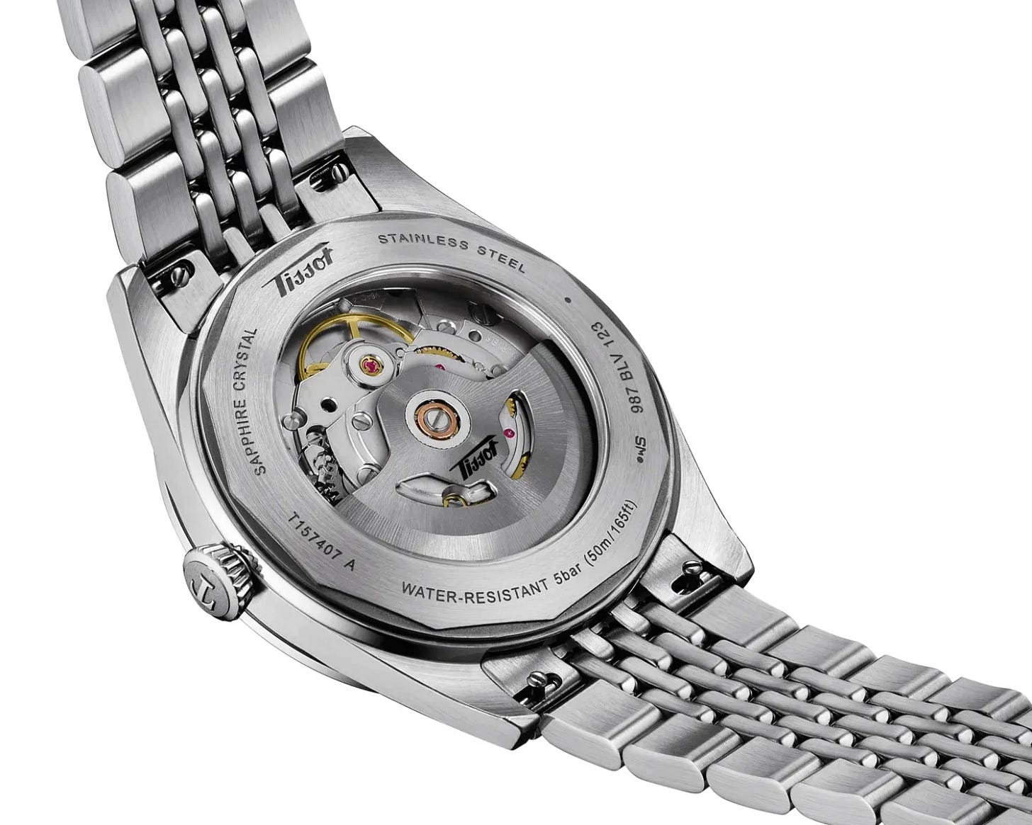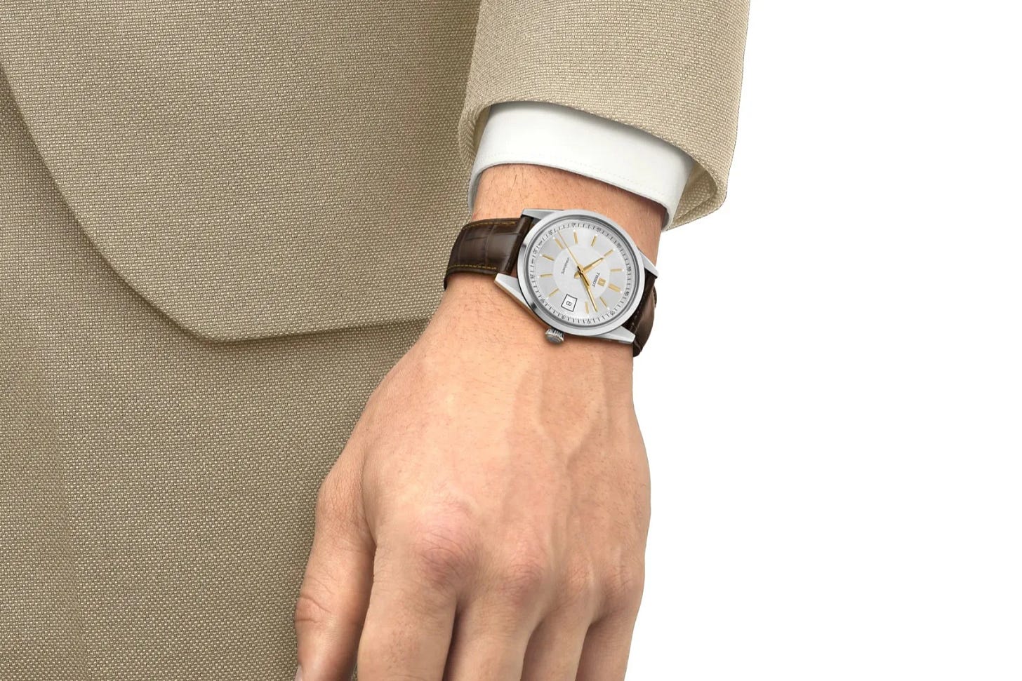 Tissot pairs the blue and black versions with a beads of rice bracelet, which suits the watch better than a flat link would. The silver dial with gold accents comes on brown leather, leaning more traditional. Both make sense.