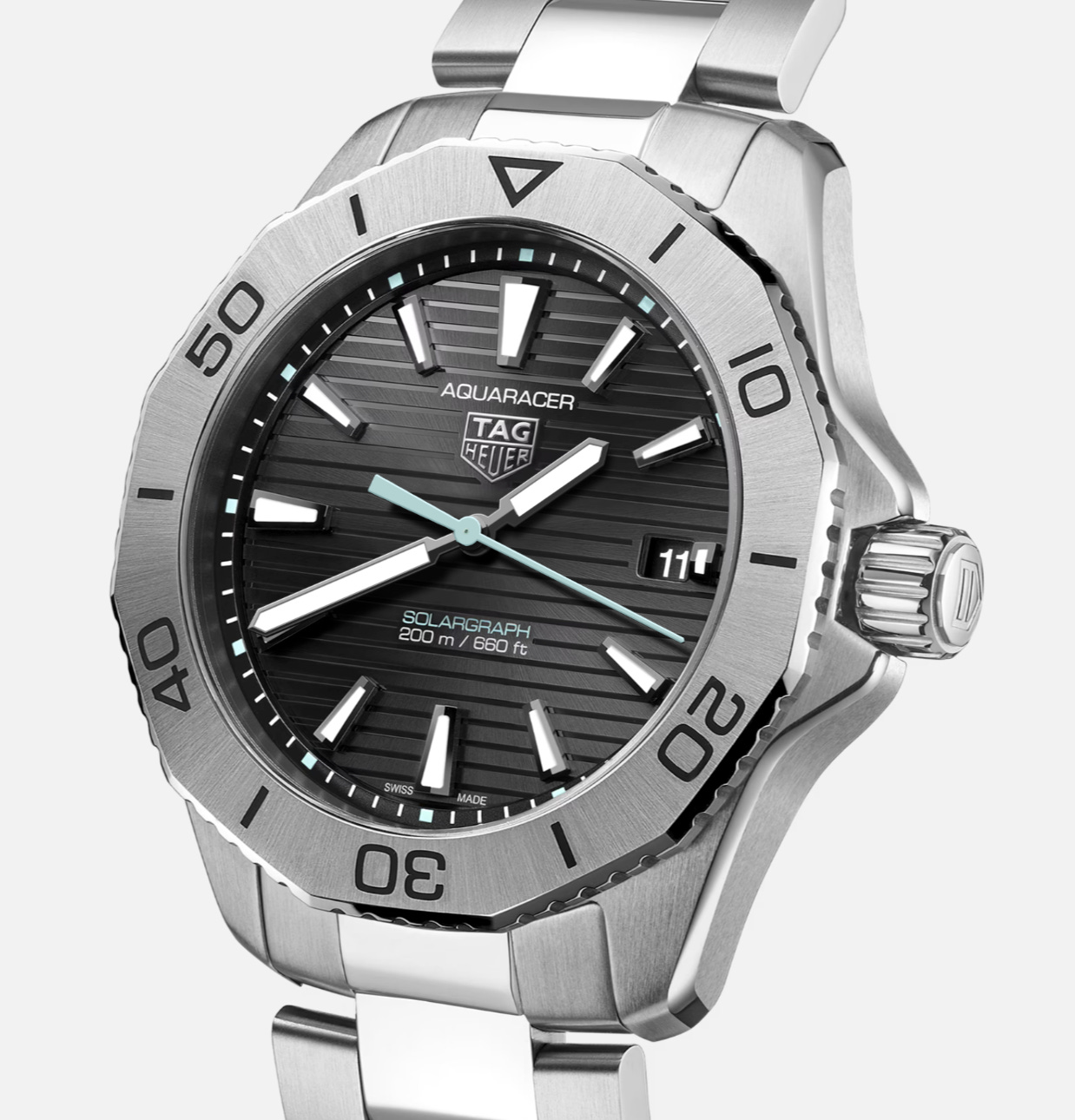 The TAG Heuer Aquaracer is the more “luxury sport” option at the same 34mm size. It has the classic Aquaracer look with a bezel, sharp markers, and good water resistance, but uses TAG’s solar tech to keep the movement running from light. It suits someone who wants a serious tool watch feel in a smaller case, with the bonus of set-and-forget power.