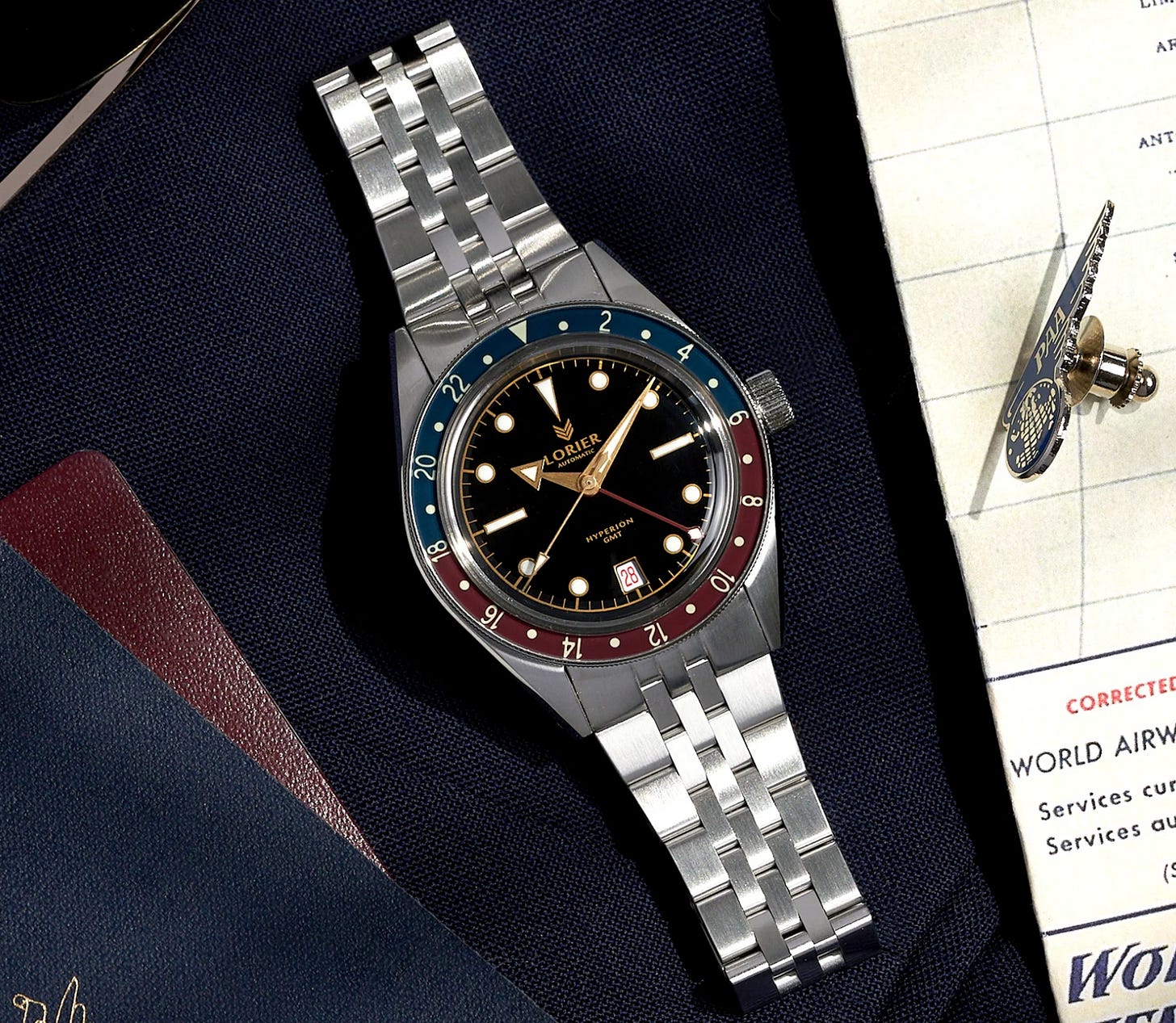 The Lorier Hyperion Series II is another Miyota 9075 GMT, priced at 699 dollars. It brings a vintage leaning design, slim case, and a true traveler movement into one of the most accessible packages in this group.