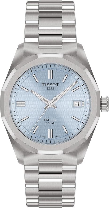 The Tissot PRC 100 Solar 34mm is a clean, modern sports watch in a compact size. It has a bright, easy to read dial, a solid steel case, and a solar powered quartz movement, so it tops itself up from light. That means no regular battery swaps and almost no maintenance beyond basic care.