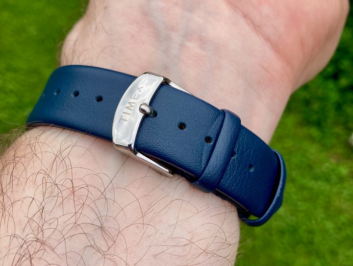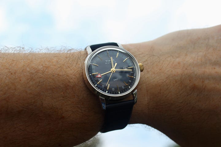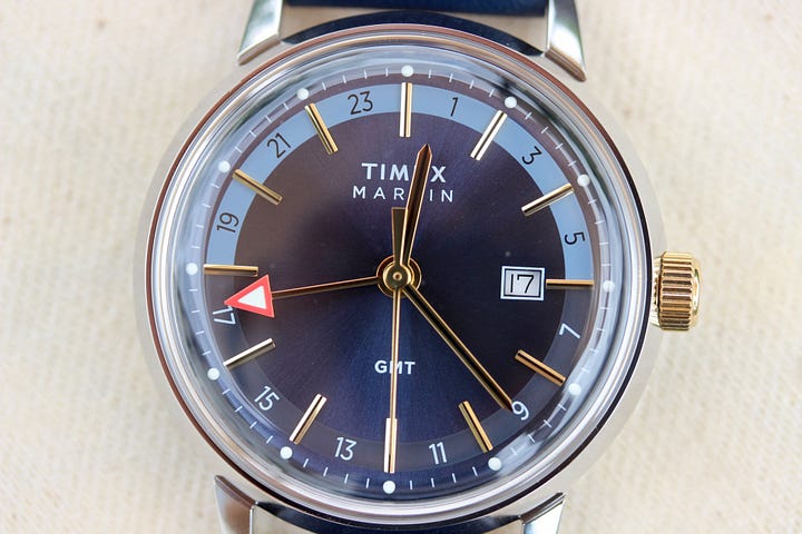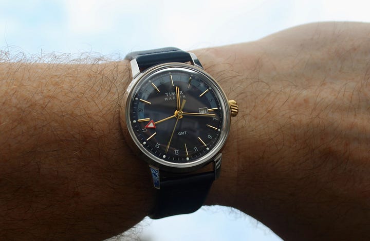 As we mentioned in that first article, the Timex Marlin Quartz GMT feels like it could have been lifted directly from the 1960s. This is due to the high-domed acrylic crystal, the minimal stick indices on the dial, and the striped handset. You’ll see lumed pips on the hours at the edge of the dial, and those don’t feel out of place. In fact, it seems like a great idea, add some night time legibility.