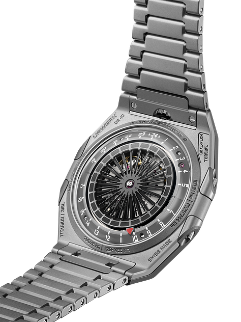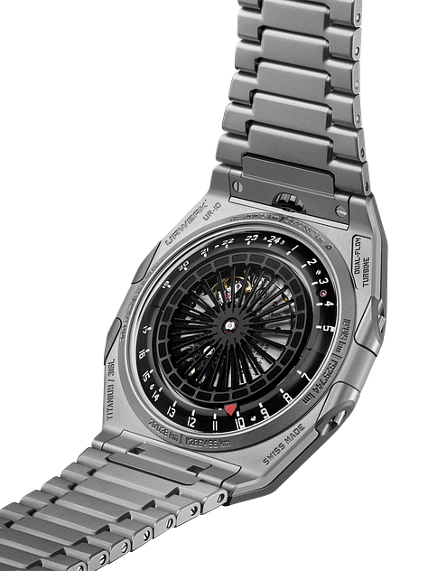 Technically, the Spacemeter is as radical as it is romantic. The UR-10.01 caliber, developed with Vaucher Manufacture, is a self-winding movement with twin barrels and a patented dual-turbine rotor. Its skeletonized LIGA wheels weigh less than an eyelash, and its thin 7.13mm titanium-and-steel case is screwed together laterally—a nod to Gérald Genta’s structural minimalism.