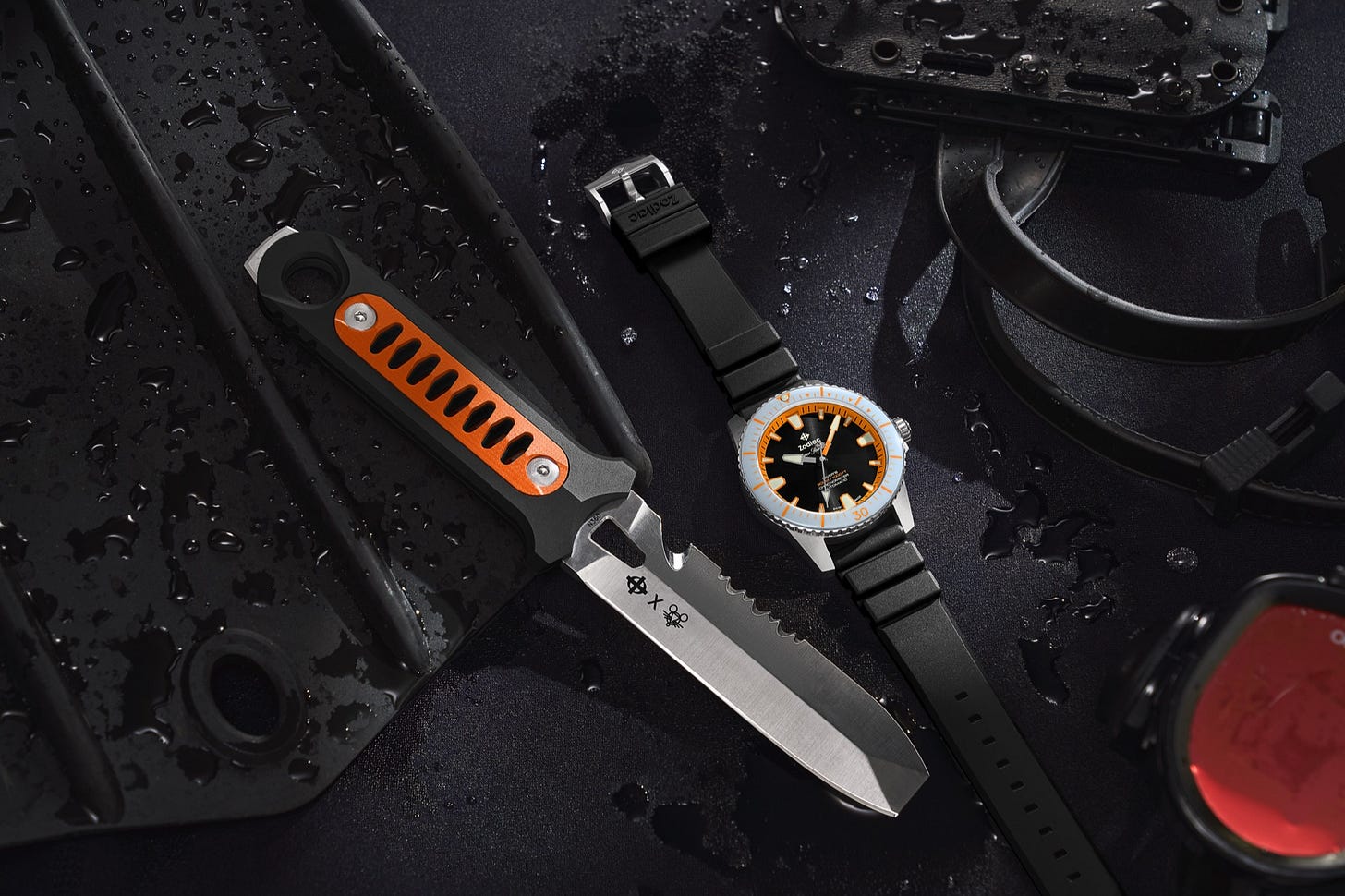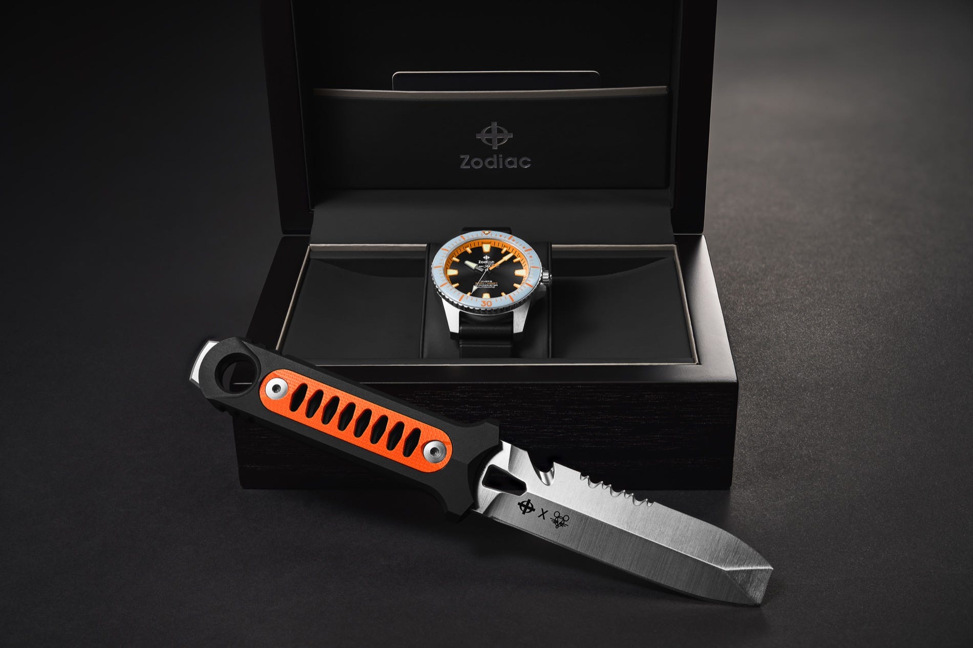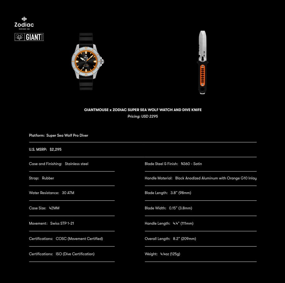 On the watch side of things, they’re starting with the Zodiac Super Sea Wolf Compression, done up in a color scheme we’ve seen from them in the past - silver case, black dial, and orange accents. This then is paired to a new dive knife (at least, we couldn’t find a similar model on their page) from GiantMouse, done up in the same color scheme.